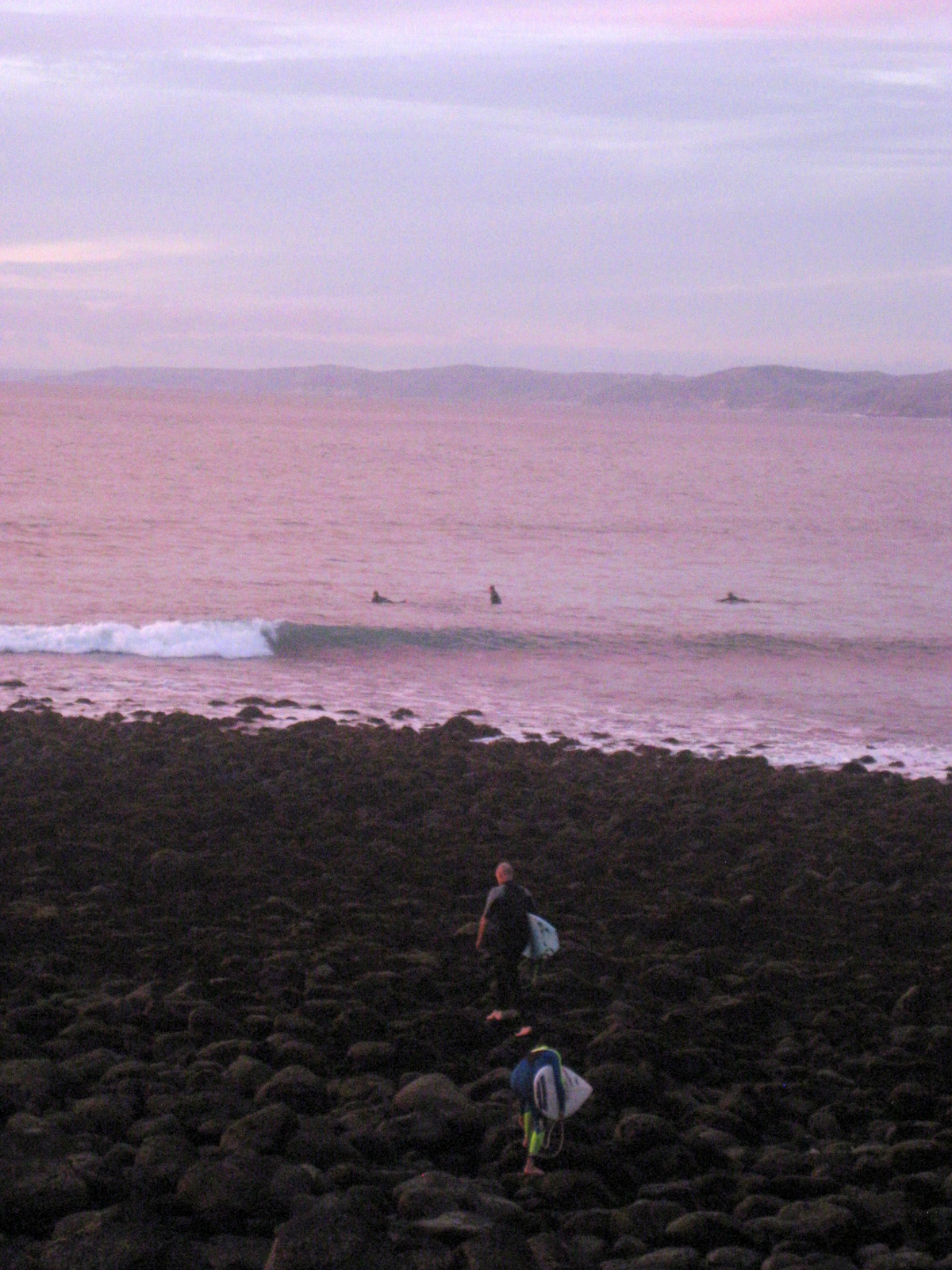 In warm autumn sunshine, we went to watch a couple of hundred surfers paddling out round the famous breakers, then gloriously, triumphantly, riding their boards up to the rocky shore. What a great sport! They even do it in the gathering gloom, when all you can see are the white sparkles on the top of the looming wave. I just tried to photograph them.